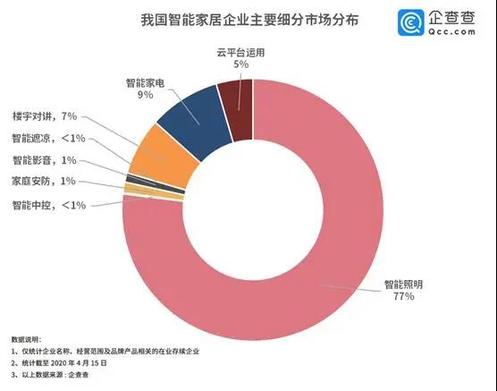 家電不再是冷冰冰的擺設(shè),而是被賦予了審美和情感需求的個(gè)性化智能產(chǎn)品。智能家居作為新興行業(yè),其無(wú)接觸式的交互方式,給疫情期間的人民帶來(lái)安全、智能的生活體驗(yàn),其優(yōu)勢(shì)開始凸顯。企查查整理了我國(guó)智能家居企業(yè)八大細(xì)分市場(chǎng),數(shù)據(jù)表明智能照明、智能家電、樓宇對(duì)講相關(guān)企業(yè)占比較高,分別為77%,9%,7%;此外,家庭安防和智能影音也頗受市場(chǎng)青睞。