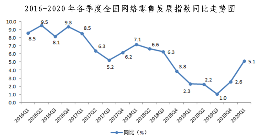 近日,中國國際電子商務(wù)中心與易觀聯(lián)合發(fā)布了2020年一季度“全國網(wǎng)絡(luò)零售發(fā)展指數(shù)”及其分指數(shù)。2020年一季度,全國網(wǎng)絡(luò)零售發(fā)展指數(shù)受疫情影響,環(huán)比下降2.7%,增速較上季度下降6.1個百分點(diǎn);但同比仍增長5.1%,增速較上季度提升2.5個百分點(diǎn)。