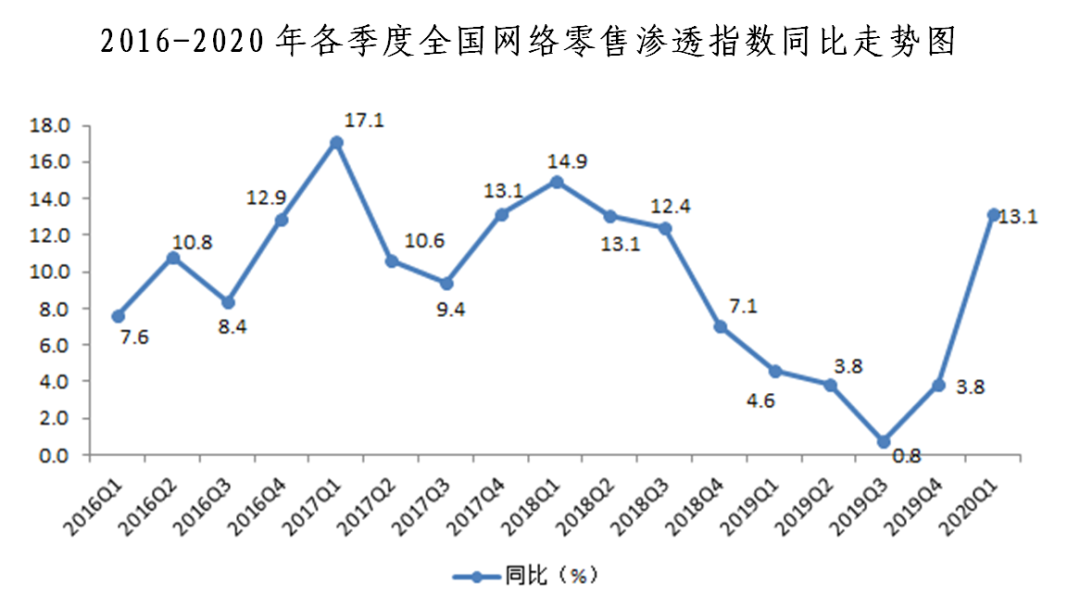 受疫情影響,線下商業(yè)嚴(yán)重受阻,各商家紛紛尋求線上渠道,生鮮到家、直播賣貨等新模式快速增長。根據(jù)國家統(tǒng)計局?jǐn)?shù)據(jù)計算,一季度實(shí)物商品網(wǎng)上零售額為18536億元,占社會消費(fèi)品零售總額的比重達(dá)23.6%,比上年同期提升5.4個百分點(diǎn)。