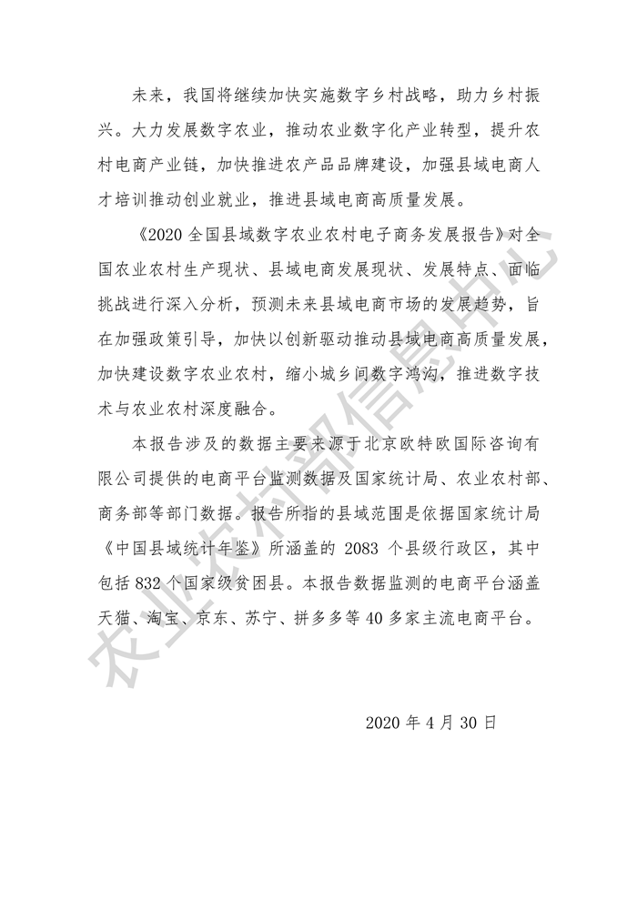 4月30日,農(nóng)業(yè)農(nóng)村部信息中心聯(lián)合中國國際電子商務中心研究院在京舉辦《2020全國縣域數(shù)字農(nóng)業(yè)農(nóng)村電子商務發(fā)展報告》線上發(fā)布會。
